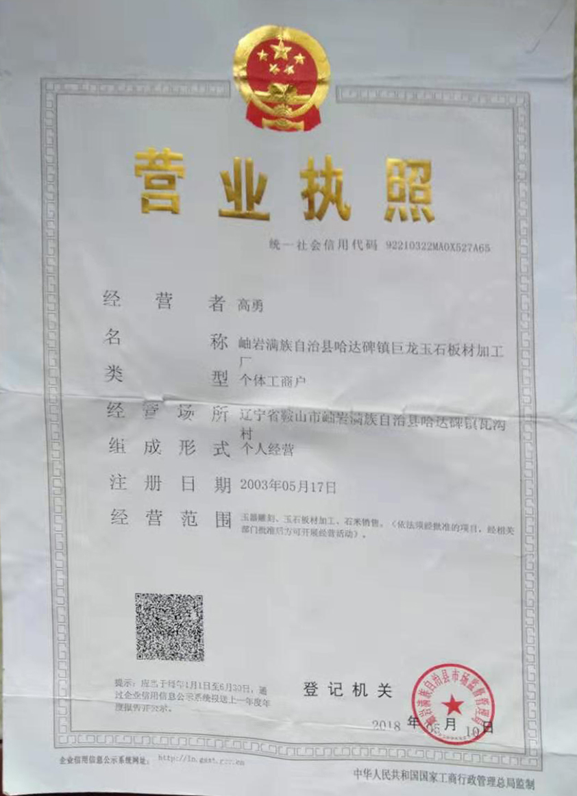 鞍山市岫巖縣哈達碑鎮巨龍玉石板材加工廠,是一家集生產、加工為一體的大型私營企業。坐落于岫巖縣哈達碑鎮瓦溝村,前臨“大岫”公路,交通十分便利。