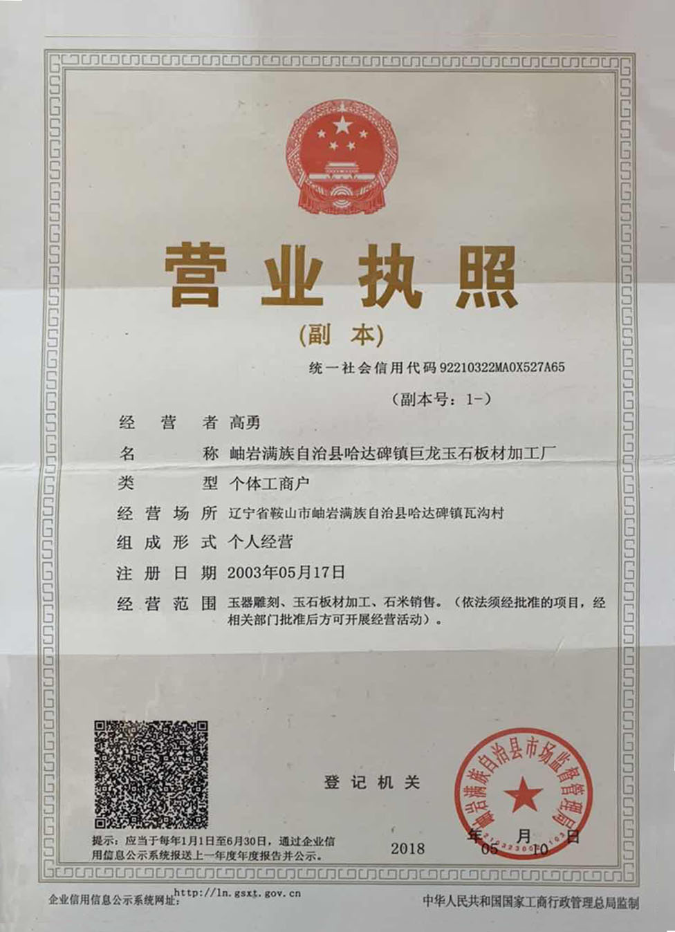 鞍山市岫巖縣哈達碑鎮巨龍玉石板材加工廠,是一家集生產、加工為一體的大型私營企業。坐落于岫巖縣哈達碑鎮瓦溝村,前臨“大岫”公路,交通十分便利。